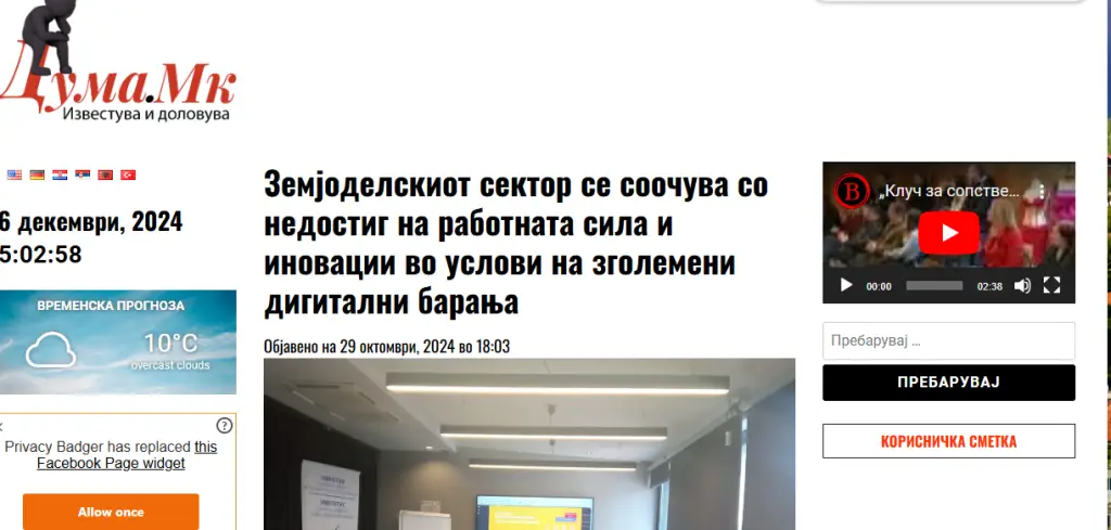 On 29 October 2024, Duma.mk published an article highlighting the challenges facing North Macedonia’s agricultural sector and the critical role of digital transformation. The feature covered the SMARTLABOUR project and its workshop held on 3–4 July 2024 in Skopje, aiming to foster innovation, digital adoption, and workforce development in the Western Balkans. Supported by the […]